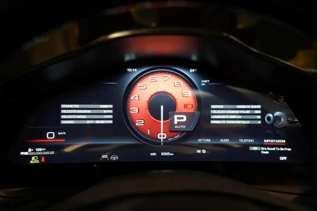 另外,这块仪表屏也用到了最顶级的屏幕,显示效果非常细腻。UI设计也遵循了法拉利的传统,将转速表放置在正中间。