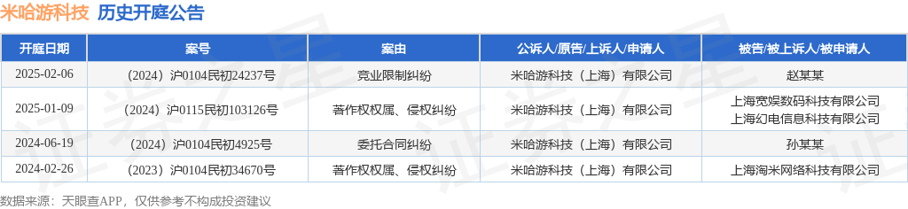 案号:(2024)沪0104民初24237号审理法院:上海市徐汇区人民法院案由:竞业限制纠纷当事人信息: 原告/上诉人:米哈游科技(上海)有限公司 被告/被上诉人:赵某某开庭日期:2025年2月6日根据统计,近一年内以米哈游科技(上海)有限公司为当事人的历史开庭公告有4则,其中案由为“著作权权属、侵权纠纷”的公告以2则居首,其次为“委托合同纠纷”有1则,“竞业限制纠纷”有1则。历史开庭公告如下:
